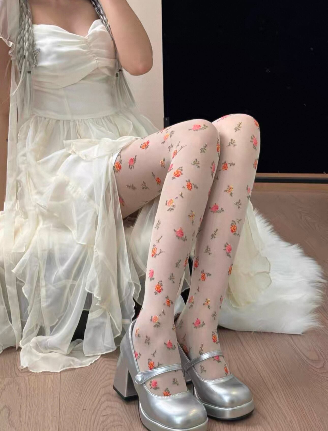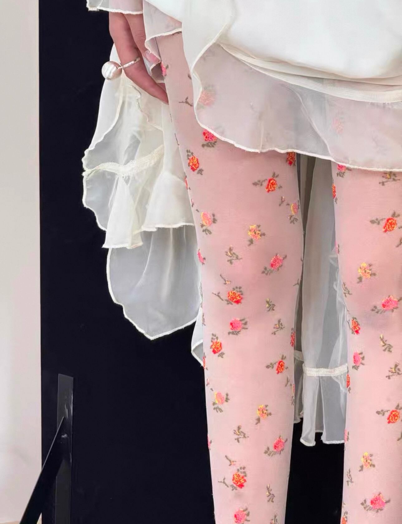 Hot BonBon フラワーデザインストッキング(クリーム)
